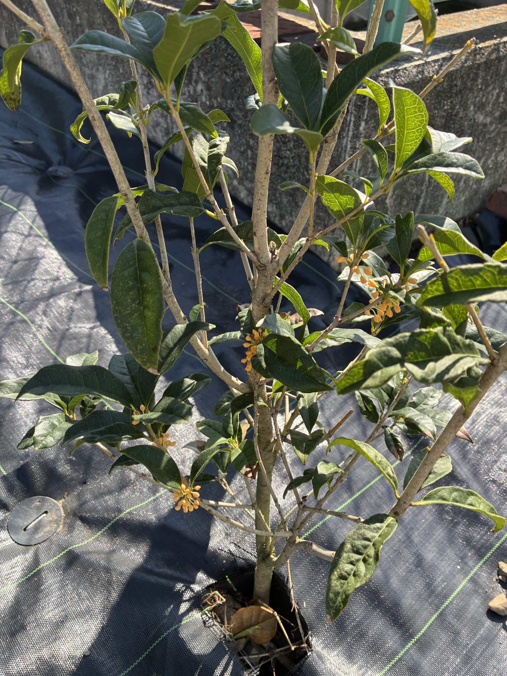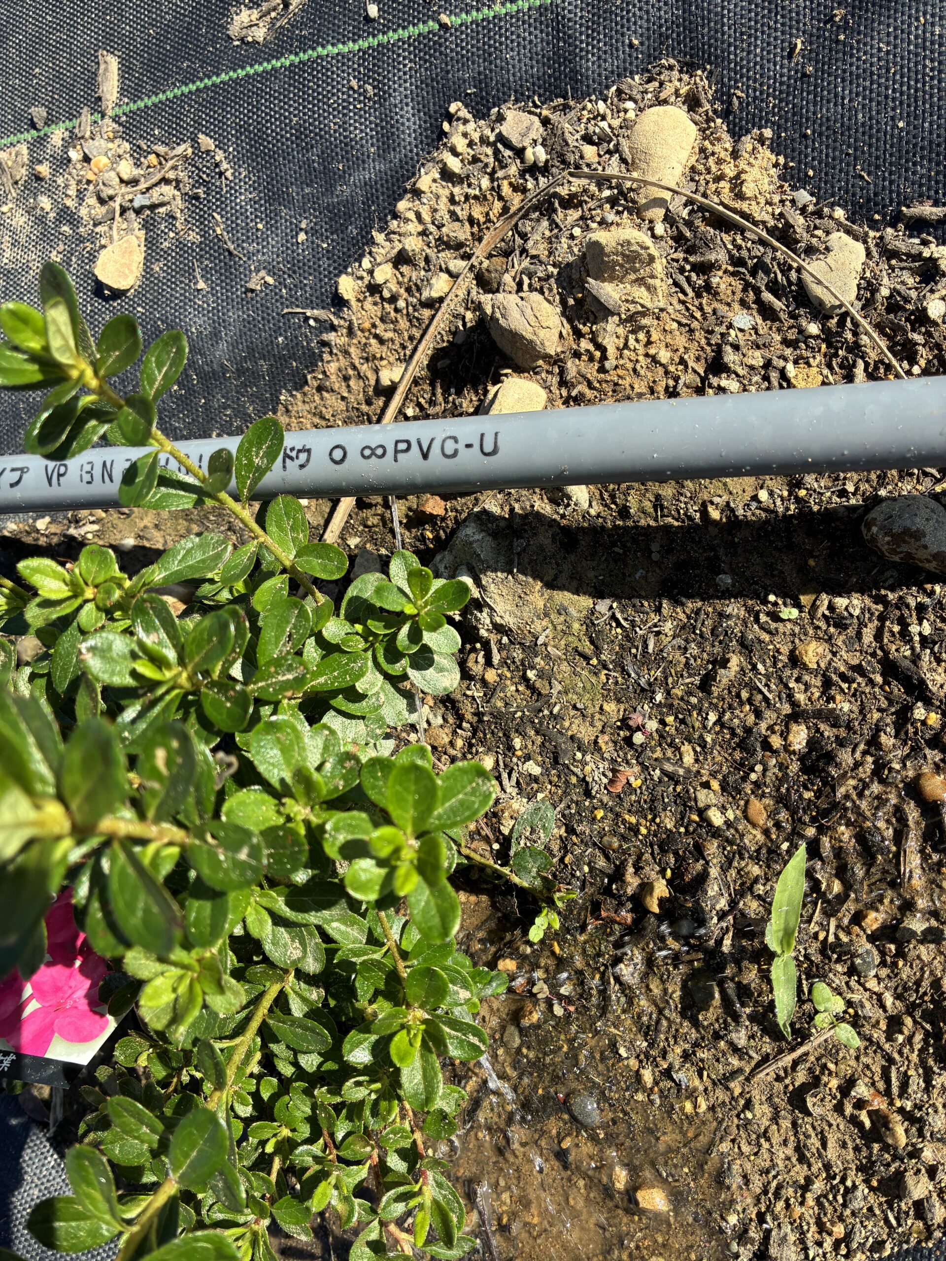 そして、雨水タンクから、パイプを通って水が流れ、きちんと樹の根元に水がかかるようにパイプに穴をあけて工夫してくれた。植えて、2週間ほどで、キンモクセイの花が咲き、うっすらと良い香りが漂う草が生い茂っているより、はるかにスッキリした見栄え!!
