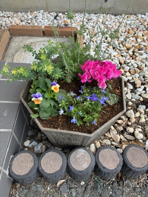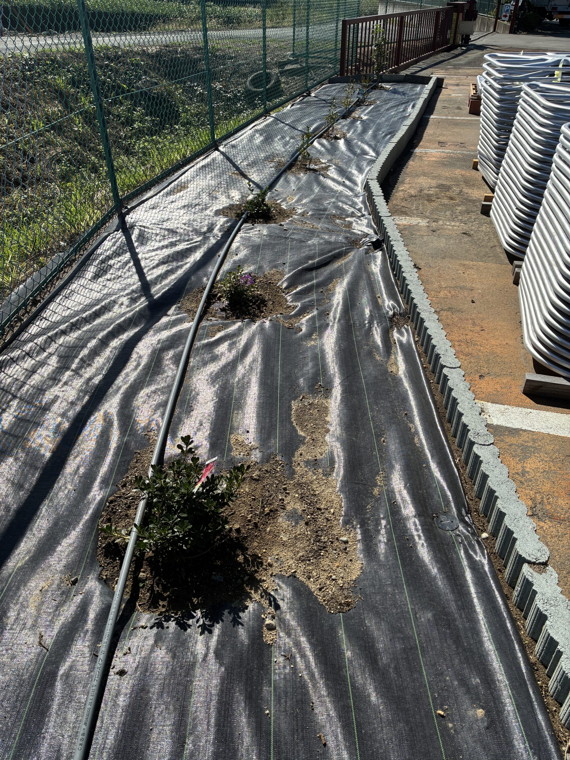 工場の敷地の堺のフェンスは、すぐに草が伸びてしまい、なかなか手入れが行き届かなかったが社員で、草を刈って、土を掘り起こし、ブロックを並べ、ちょっとした花壇の出来上がり!